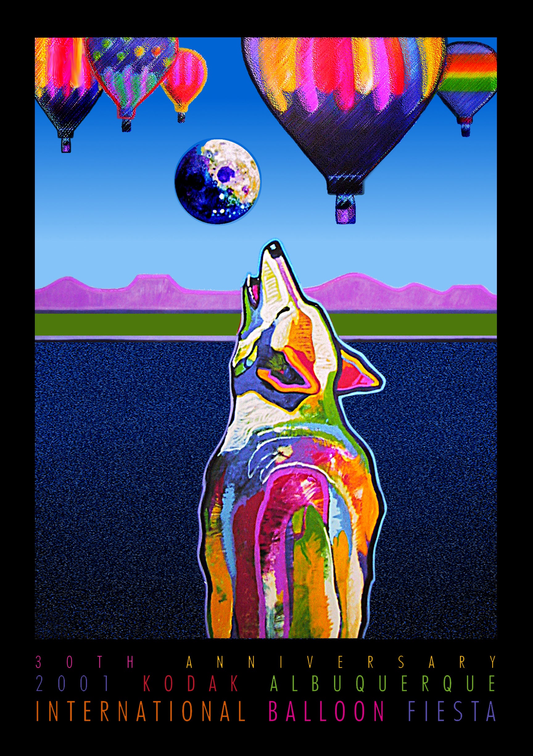 Twenty-third in the series by John Nieto.One of the most important artists working in the United States today, Nieto pioneered contemporary interpretations of the Southwest, turning traditional subjects into timeless icons of brilliant color. His paintings and prints are universally recognized and highly valued, having been exhibited throughout the United States, Europe, Asia, Latin America and Africa. Included in the permanent collection of the National Museum of Wildlife Art, Nieto is a recipient of New Mexico's prestigious Governor's Award for achievement in the arts. In this 30th anniversary commemorative poster for the Balloon Fiesta, he portrays a coyote in the tranquil desert landscape, undisturbed by the lighter-than-air ships floating in the stunning variegated blue sky above. This is a rare opportunity to acquire an original silk-screen print by an internationally collected artist at an outstanding value.