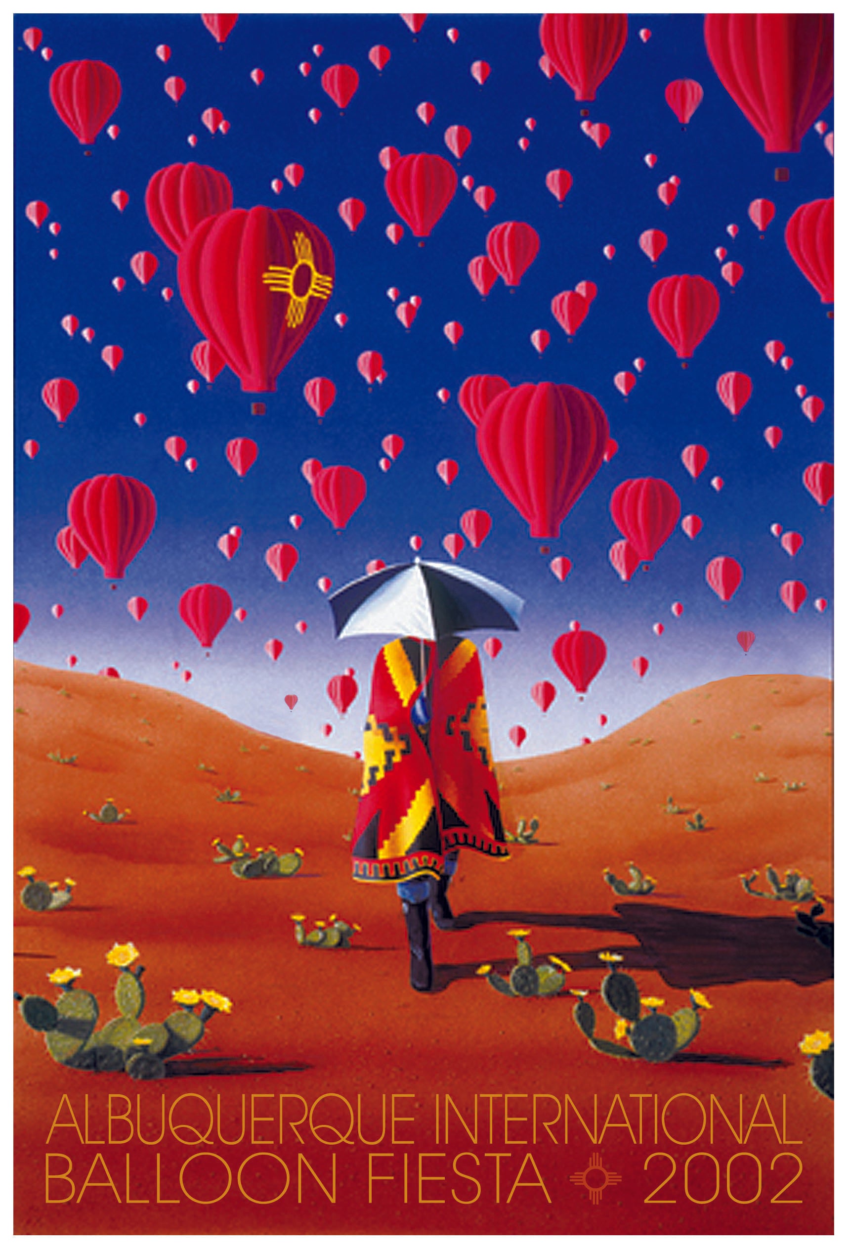 Twenty-fourth in the series by Mark Pacan. Balloonists world-wide have collected the work of British artist Mark Pacan for over two decades. When he agreed to accept our commission, we saw an opportunity to collaborate with the world's premier balloon artist. The result is a timeless allegory combining a sky dense with balloons, a desert in bloom and a traveler wrapped in the three great cultures that inhabit this ancient land. This is what snow looks like in Albuquerque in October through the eyes of an avid balloonist. A blue-jeaned figure walks through a smooth desert landscape, warmed by a traditional Navajo blanket and shielded from the sun (or is it the balloon deluge?) by an equally vintage Anglo invention: The steel ribbed umbrella. The artist's use of hyper-realistic color envelopes the overall concept, adding an inviting patina to the dreamy Magritte-esque scene. This original serigraph harkens back to the classic posters produced by ProCreations at the very beginning of this series.