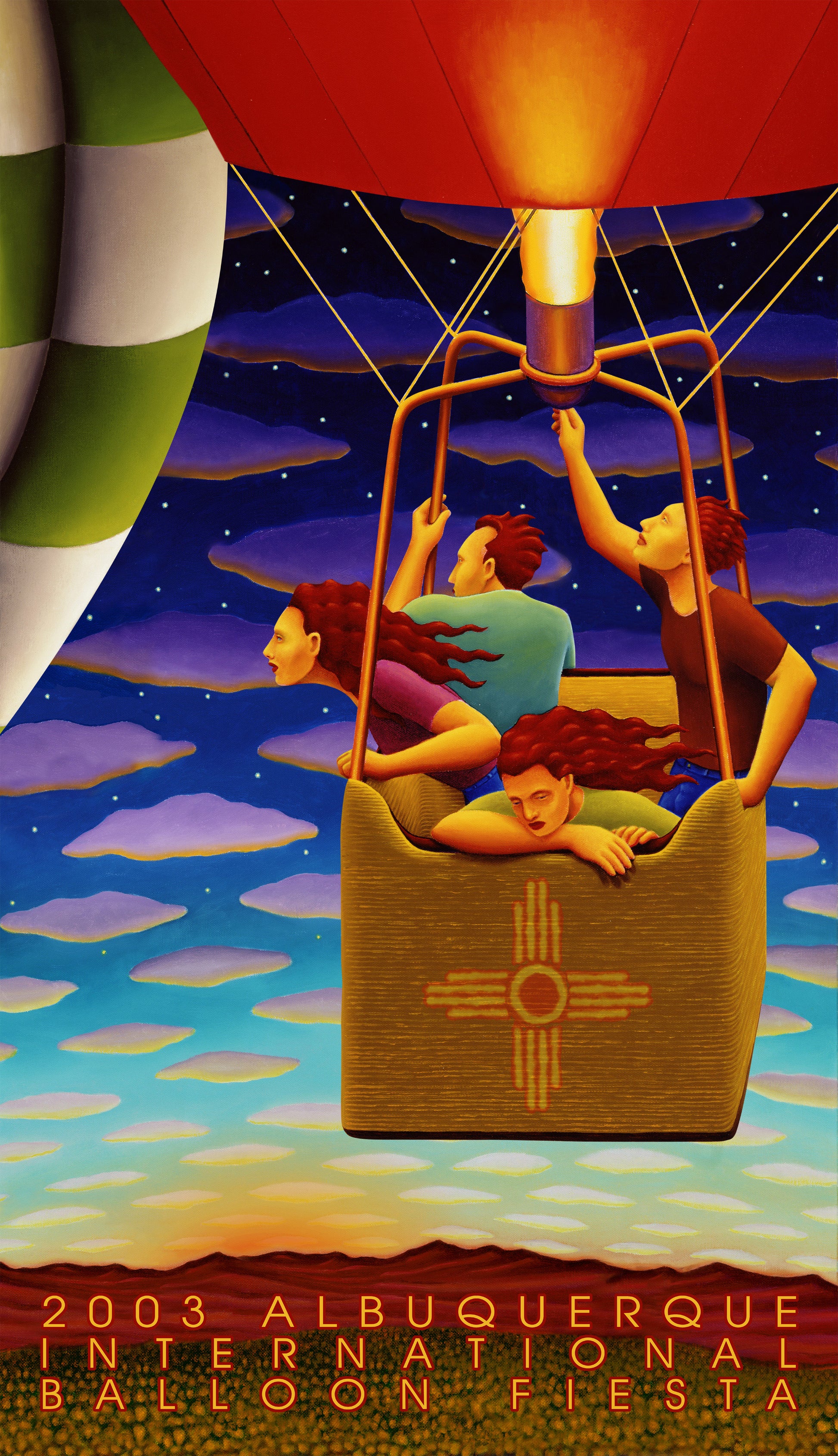 Twenty-fifth in the series by Bill Jonas. For this milestone anniversary of the series, Jonas echoed the first poster ever done for the Fiesta, the classic 1979, depicting a single partial balloon and the edge of an adjacent one. Expanding on that image, the pilot is joined by three awed passengers. The beautiful blended sky and cloud forms hint at the dawn patrol that precedes each day's Fiesta events. The landscape below is shrouded in twilight. Jonas is widely admired for his meticulously crafted dreamscapes focusing on people engaged in higher pursuits. In the case of this poster, that description can be taken literally. His oil paint blending techniques are so time consuming that he produces as few as four paintings a year. We count ourselves lucky that one of those was the 25th installment of the Balloon Fiesta poster.
