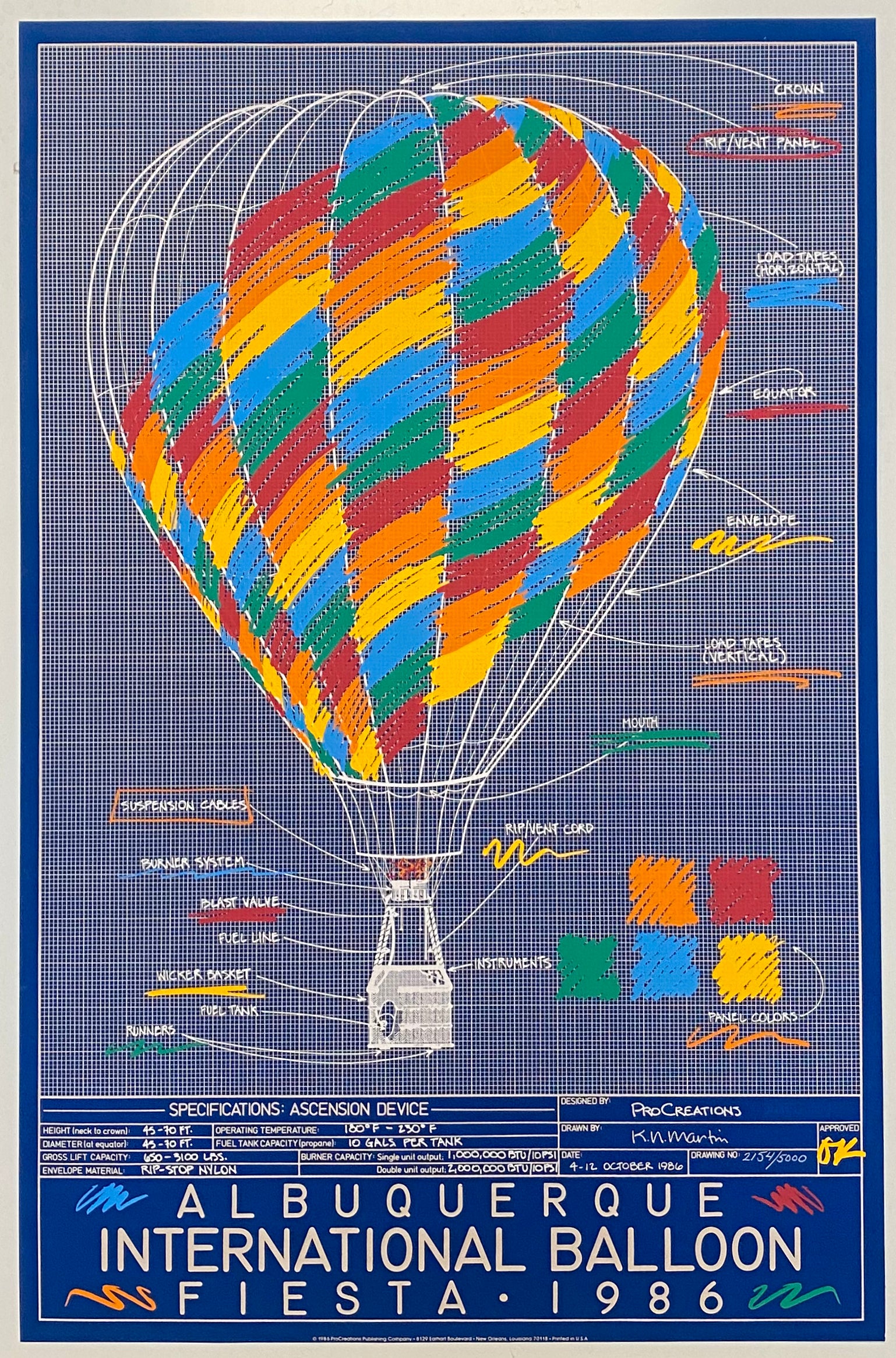 Eighth in the series by K. N. (Nikki) Martin. A wondrous tongue-in-cheek exploration of the "structure" of a hot air balloon. The artist first rendered a perfect technical blueprint complete with a balloon's build and operating specifications, then used colored pencils to bring the scale drawing to life and give it dimensionality. The print sold out immediately. Though completely different from the 1979 premier Fiesta poster, the 1986 image is considered to be of equal stature, sharing the same imaginative magic. To accommodate the anticipated demand for the print, the signed edition was increased to 750 prints.