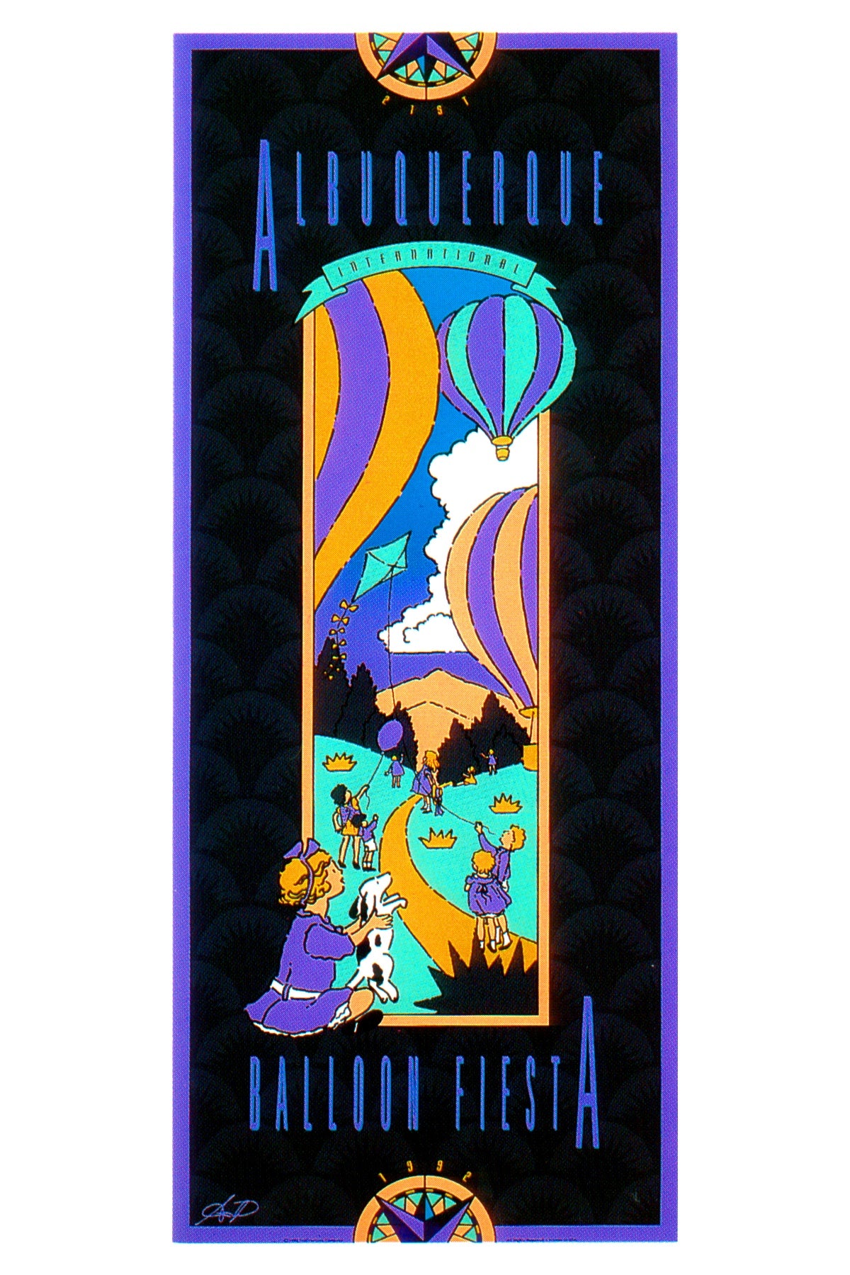 Fourteenth in the series by Steve Wedeen. The artist was brought to our attention as a result of his partnership with 1988 Fiesta poster artist Rick Vaughn in their pre-eminent Albuquerque-based graphics studio. Here he creates a successful counterpoint juxtaposing a child's fascination with hot air balloons against a boldly graphic frame. The slender format with compass points top and bottom helps the artist achieve a notable elegant result.