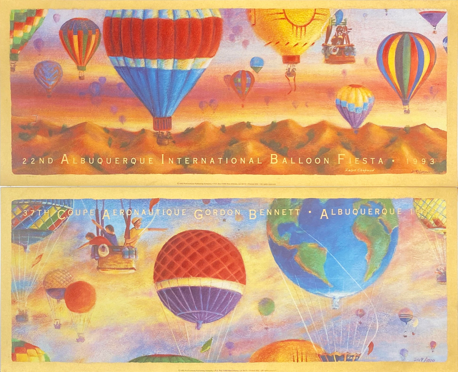 Fifteenth in the series by Ralph Chabaud. This poster is recognized for a number of firsts: It is the first Fiesta poster created as a true diptych (two-part poster available as a unit or individually) with each half forming a complete image, with both creating an interlocking totality; it was the first time gas balloons were portrayed, in honor of the Fiesta's hosting of the 37th Gordon Bennett classic. It is a thoroughly modern image yet curiously reminiscent of art produced when the Gordon Bennett race was first run in the late 19th century. With its fine gold lettering, this poster is right up there with the classics of '79, '86 and '90.