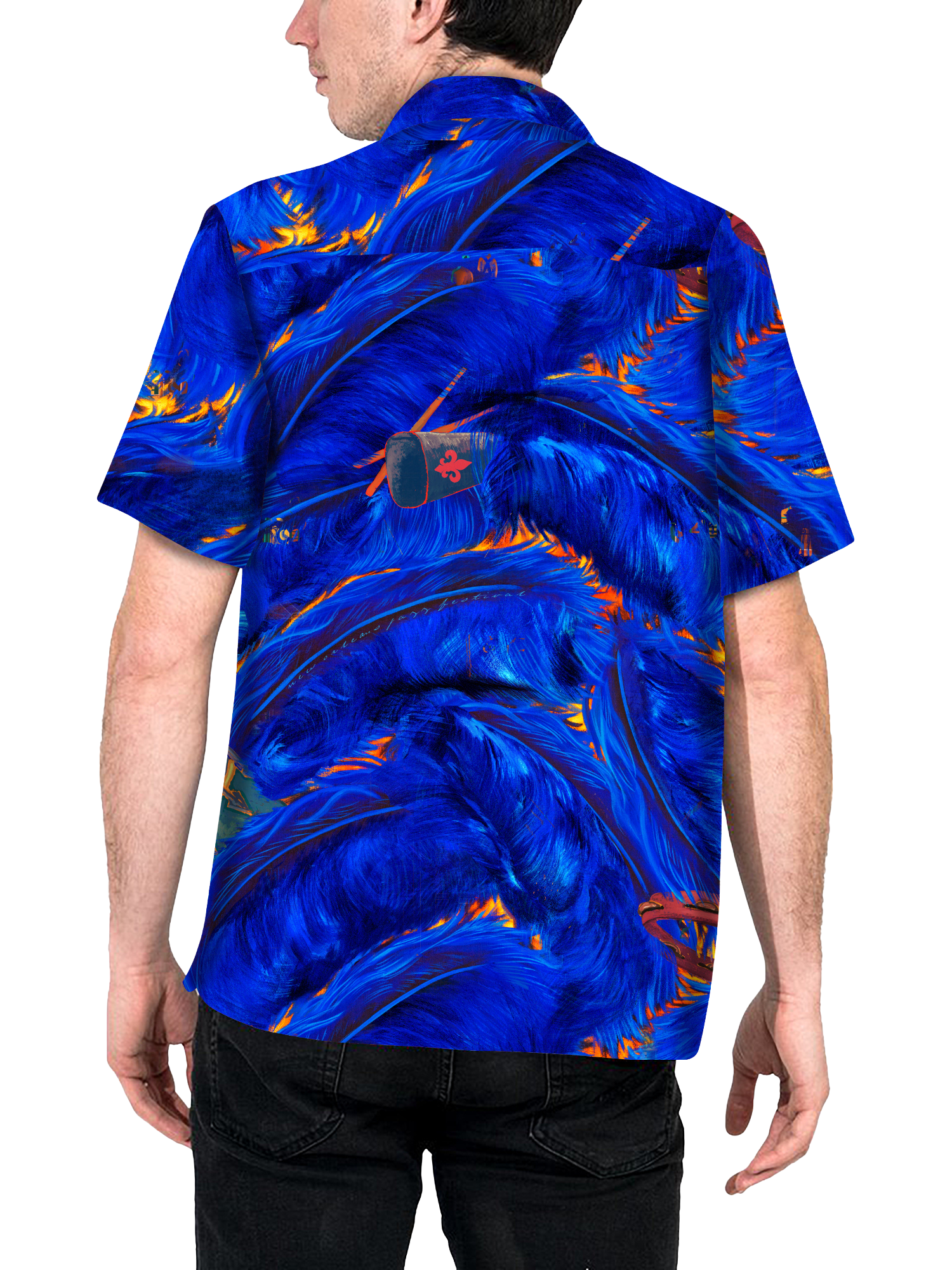 Rhythm In Blues is inspired by Frenchy’s celebration of Big Chief Bo Dollis in all the glory of his plumage in the 2015 Jazz Fest poster. Jazz Fest brought this neighborhood subculture to a broad audience. We honor that with a sea of pulsating electric blue feathers, sprinkled with rhythm instruments, flowing in a second line that delights all who encounter it. Sealing the deal are drum buttons that can't be beat.