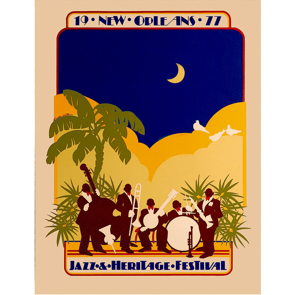 Third in the series by Kathleen Joffrion. This was the first poster to employ the "cut paper" technique to achieve bold flat areas of color. The poster celebrates the jazz ensemble in its heyday of the 1930's. The popularity of the three year old project led to a substantial increase in the number of numbered, unsigned posters produced but the edition still sold out prior to the Festival's conclusion.