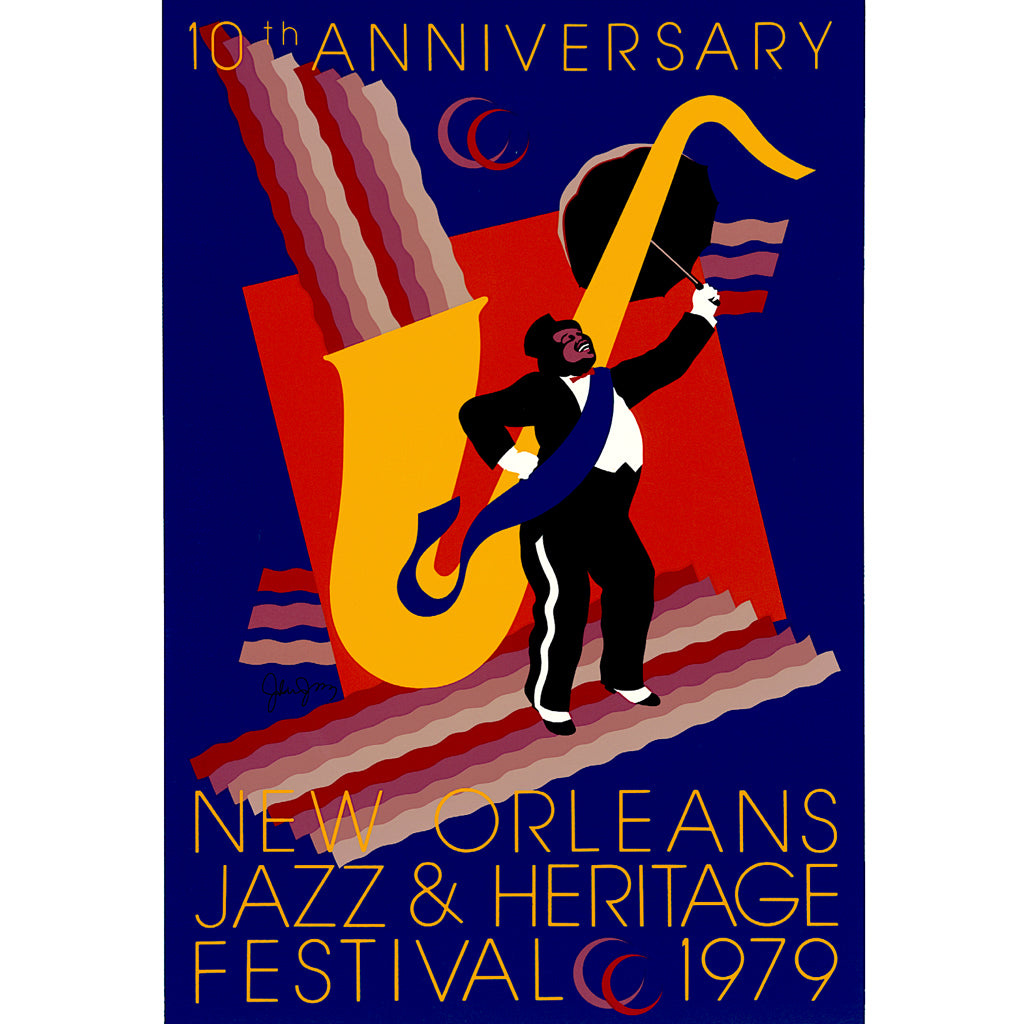 Fifth in the series by John Martinez. The grand marshal returns for the Jazz Festival's 10th anniversary; as does the "cut paper" technique first seen in the 1977 poster. The vivid palette matches the brassy celebration marking a decade of Jazz Fest. The unsigned edition was increased to accommodate the incredible demand for the now famous series, and still sold out prior to the conclusion of the Festival.