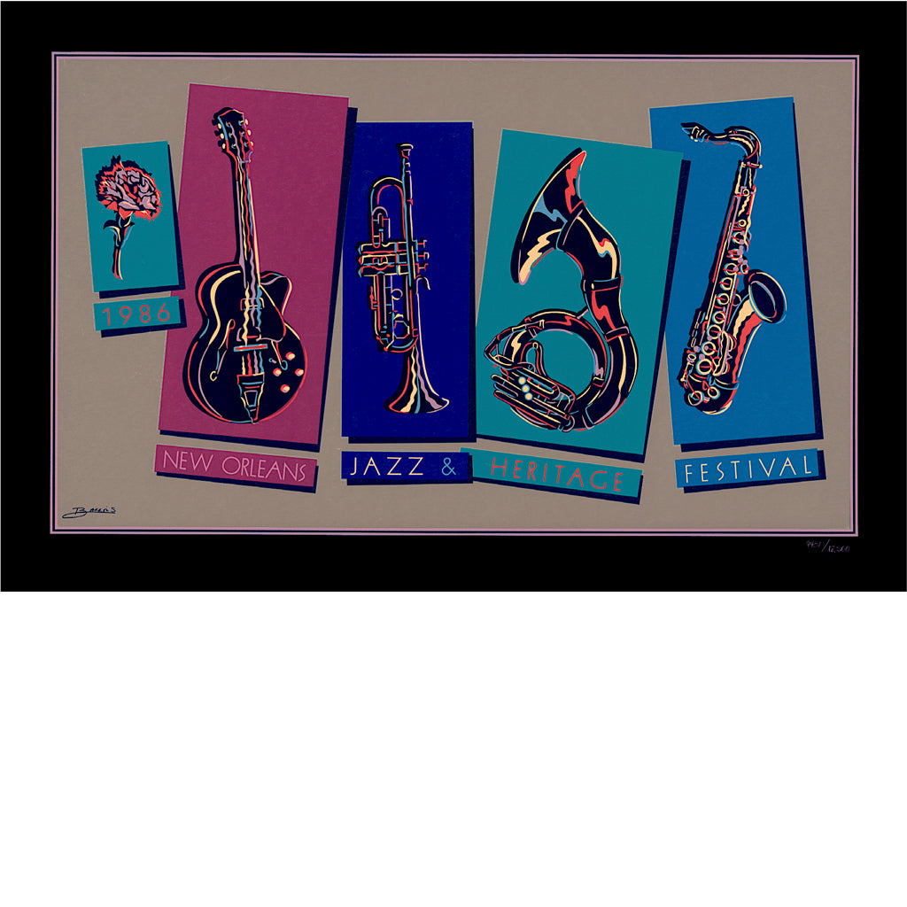 Twelfth in the series by Lyndon Barrios. This was the first horizontally formatted poster and also the first to concentrate on instruments instead of players. The concept and muted colors were a sophisticated departure from the prior posters.