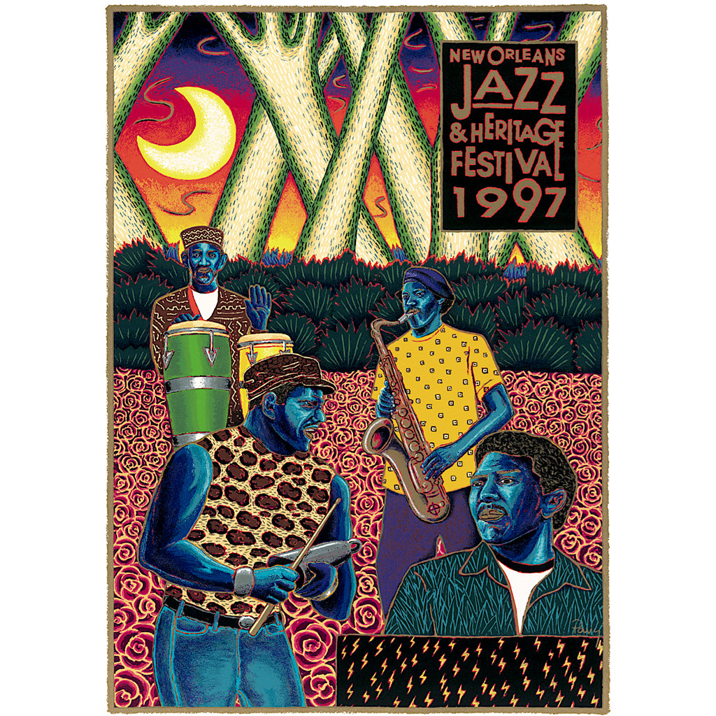 Twenty-third in the series by Francis Pavy. "The Picasso of Zydeco" is how Rolling Stone Magazine described Lafayette artist Francis Pavy. And if Picasso had painted the funkiest four brothers on earth, a/k/a The Neville Brothers, he could have done no better than Pavy's 1997 Jazz Festival poster. This moonlit day-for-night silk-screen collectible captures New Orleans' first family of syncopated rhythm playing on a bed of roses under a fiery dusk sky hung with a yellow moon. This is a magnificent 20th anniversary tribute to the Brothers joining forces to form New Orleans' most celebrated band.
