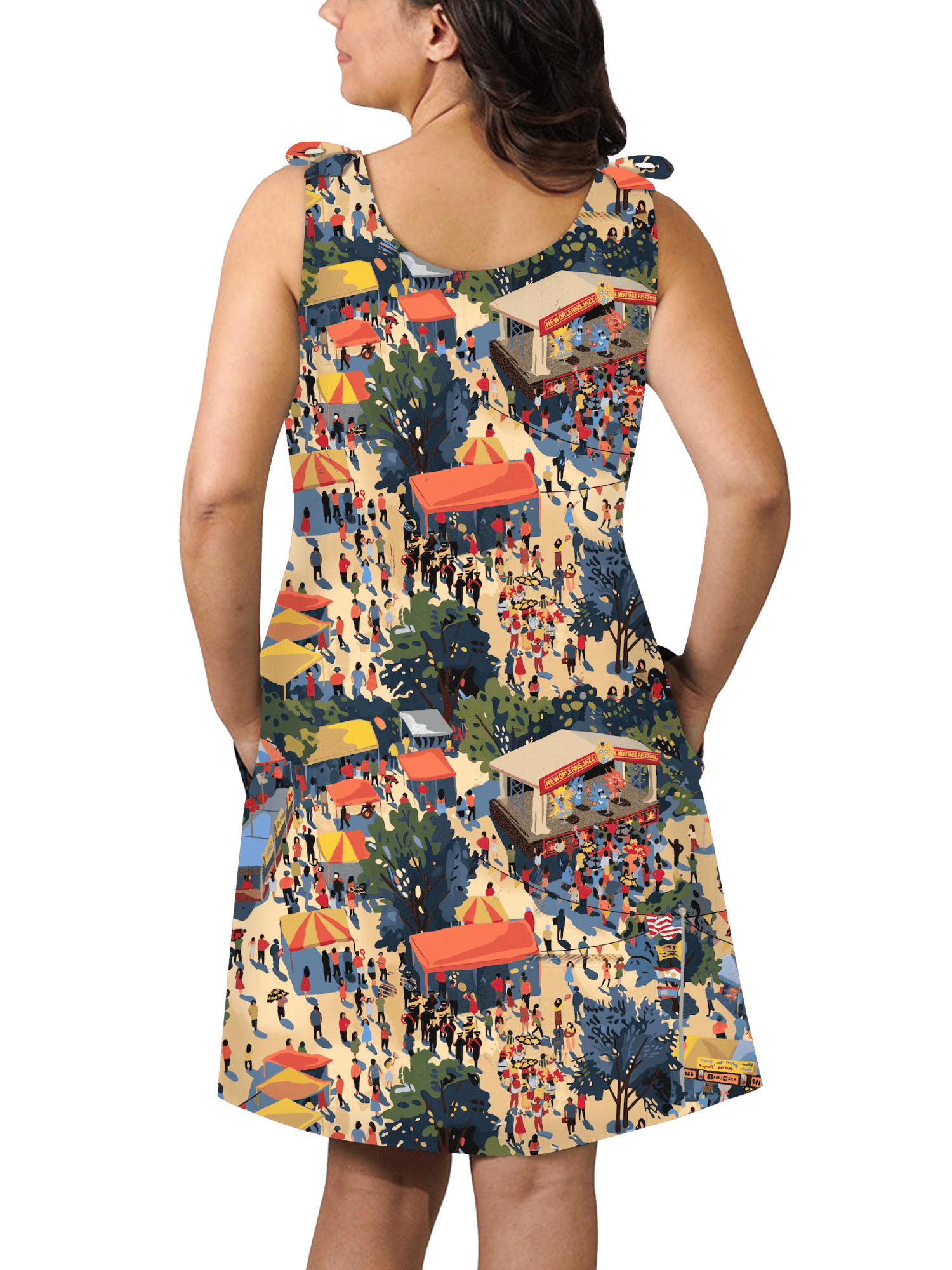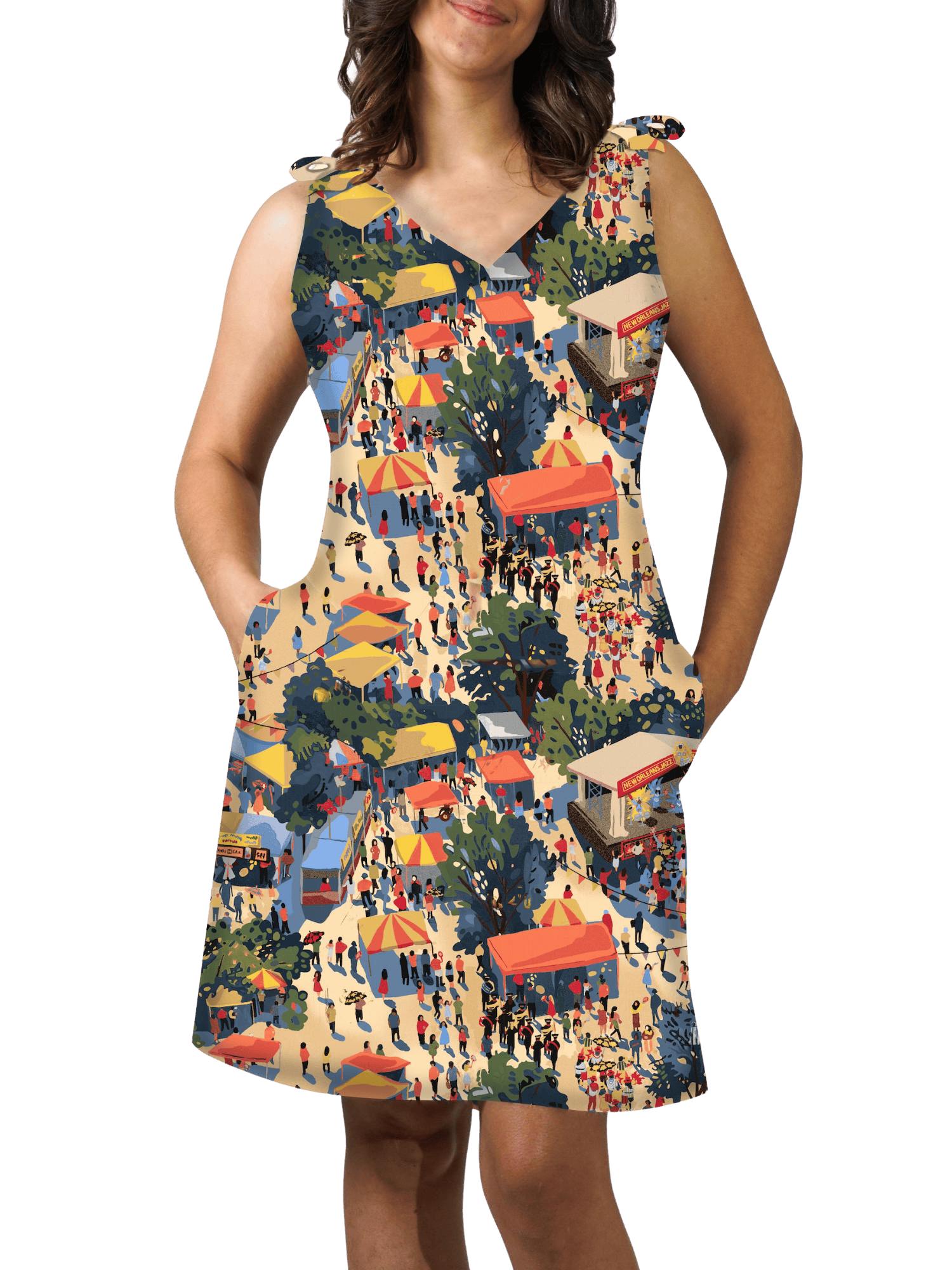 Our classic Sun Dress has a scoop neck with a tie at the waist to accent your figure. Available in Jumble YaYa, Jazz Fest Rag, and Vintage Vinyl.