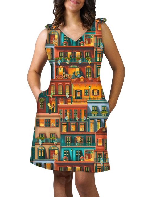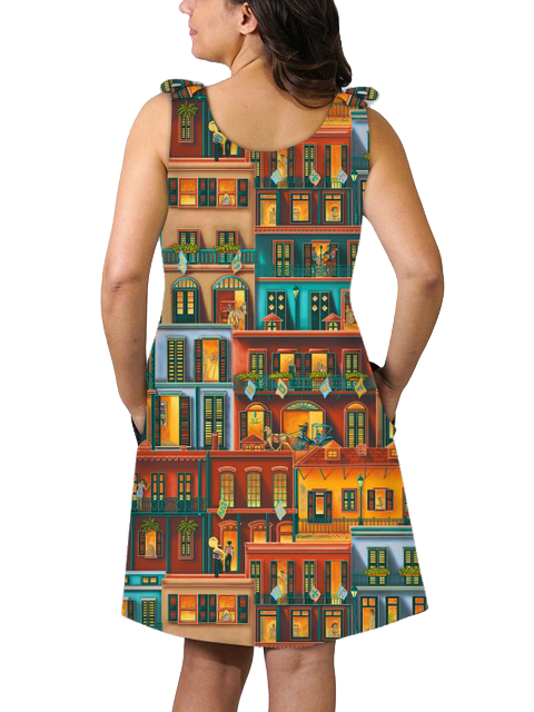 Global warming has nothing on summer in New Orleans. Our stylish dress is elegant; a delight to behold and a joy to wear. This perfect above-the-knee 3-season dress is styled with practical simplicity and timeless fashion.  Shoulder ties provide a pretty detail that allows this sheath silhouette to fit like it was made for you. This cool BayouWear® dish flatters every body.